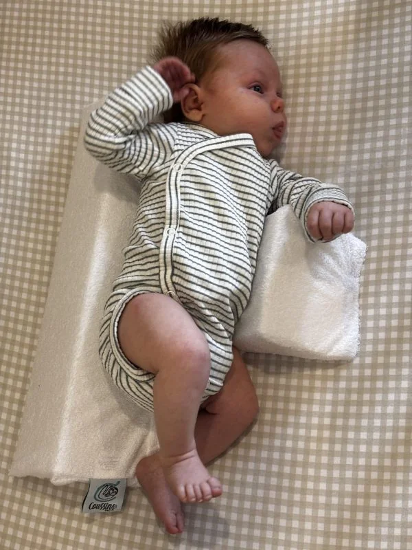 Le coussin positionneur latéral est constitué de 2 triangles en mousse raccordés entre eux, permettant au corps et à la tête de l’enfant d’être positionné en semi-latéral à 45°.